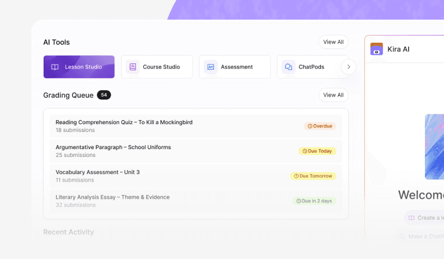 Kira operates alongside existing LMSs, curriculum, and district infrastructure today, and can absorb more of the stack over time.